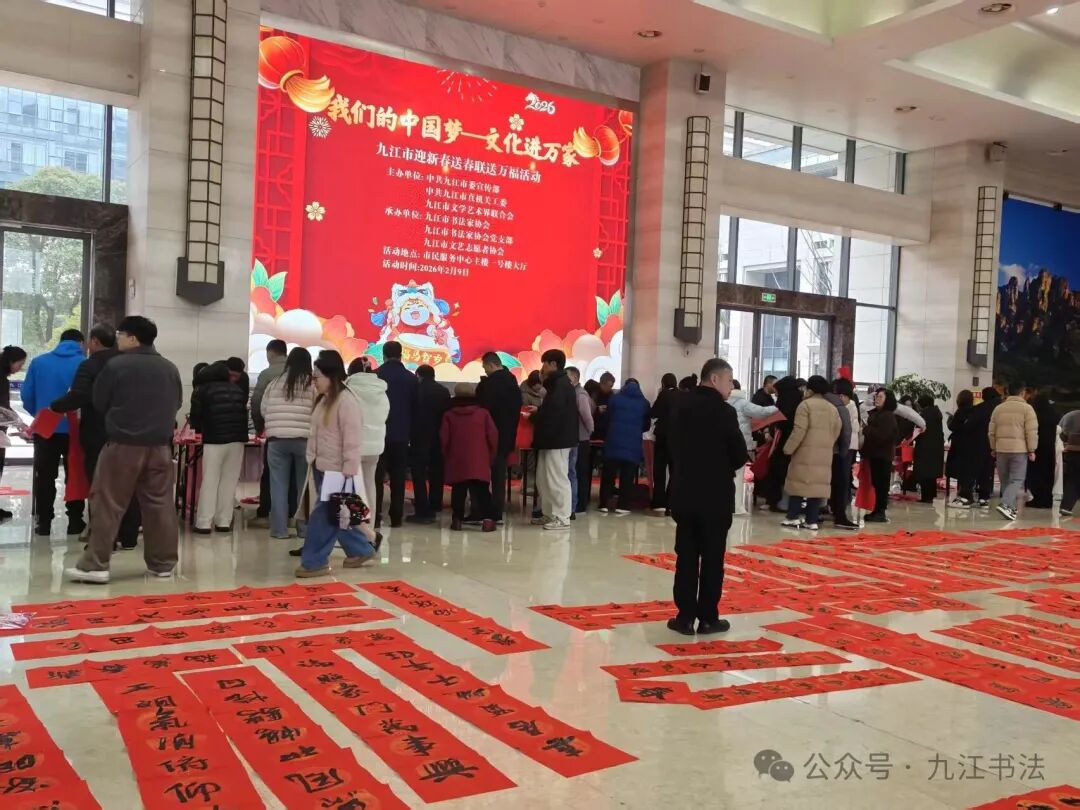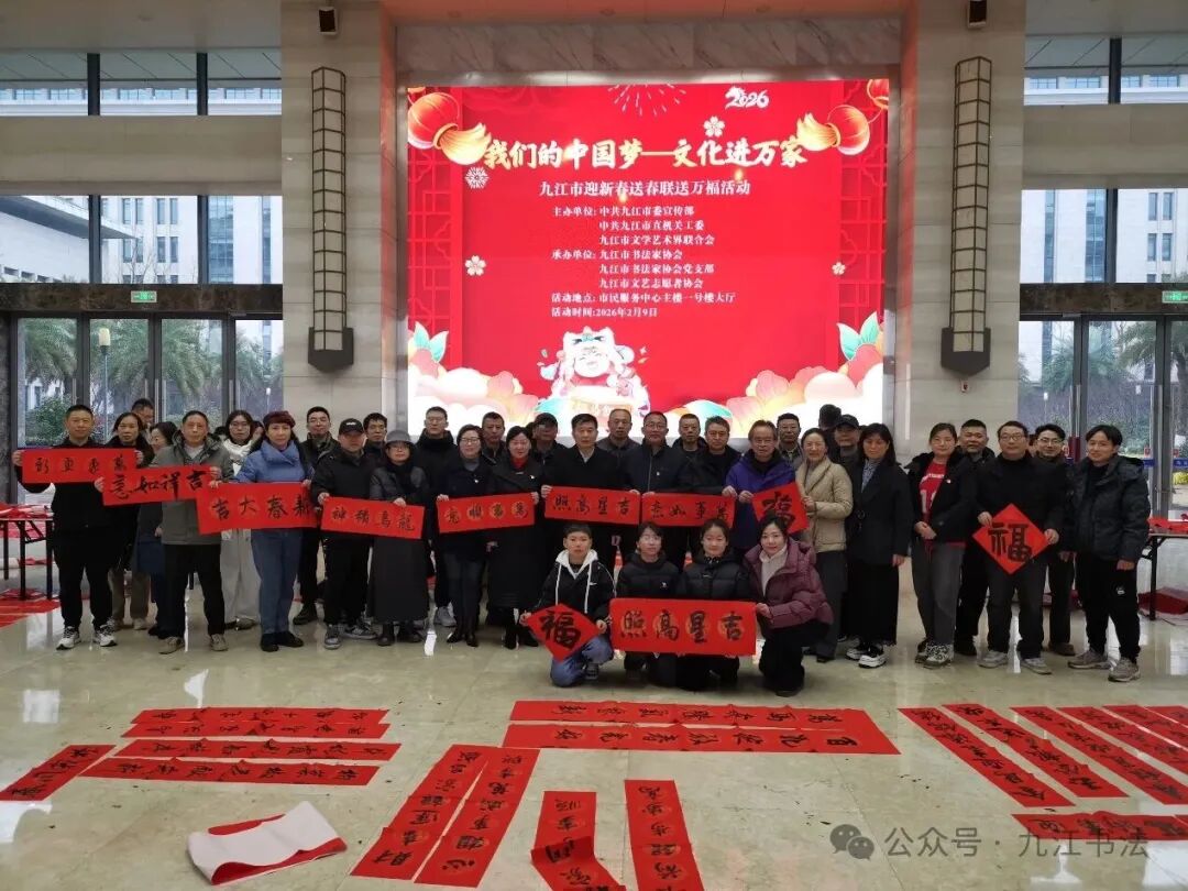 2月9日,“我们的中国梦—文化进万家”九江市迎新春送春联送万福活动在九江市市民服务中心举行。本次活动由中共九江市委宣传部、中共九江市直机关工委、九江市文联主办,九江市书协、九江市书协党支部、九江市文志协承办,以书法为媒,将新春祝福与文化暖意送到群众身边,为即将到来的丙午马年增添了浓厚的传统文化年味。