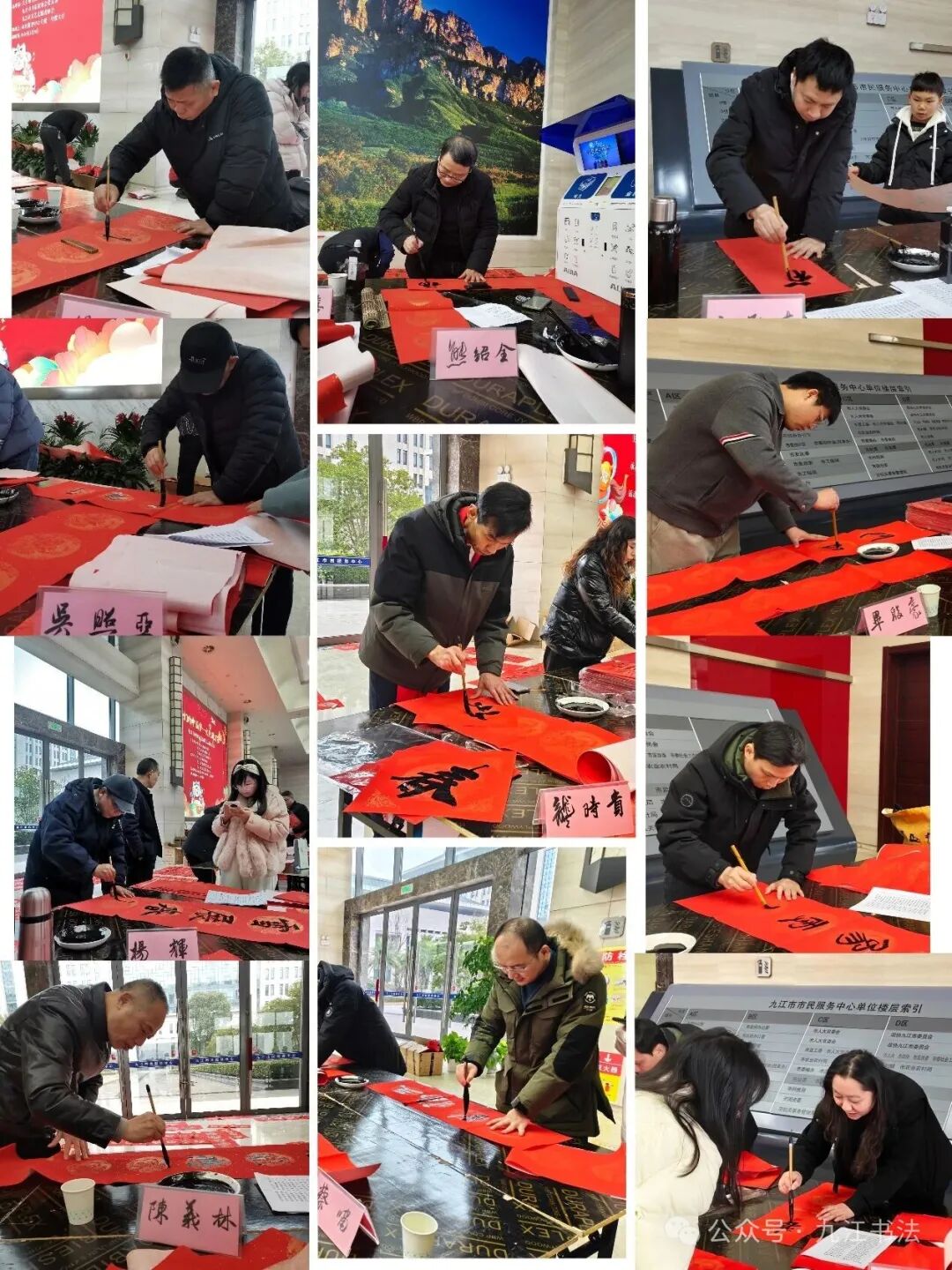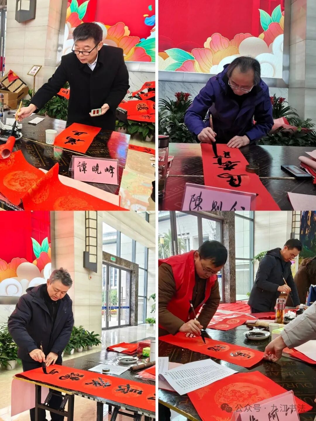 九江市政府二级巡视员谭晓峰,市委宣传部原常务副部长陈则仁,九江市书法家协会桂相文、黄阿六、游建新、熊玲琴、张龄之、吴成斌、严耀喜、曹亮明、钟秀之、赵胤、雷田之、闵菊花、曾德智、曾旺红、杨红军、桂汉书、吴照亚、杨辉、陈义林、熊绍全、龚给、蔡啸、江孔志、毕殷豪、许长青、夏霁、释演顺、凌莉、丁涛、李晋、吕幼平、明启猛、欧阳海员、黄旷兰、张文强、梁光锋、刘爱武、曾丽等多位老师和多位青少年参加了当日志愿服务书写活动。现场为群众书写春联和“福”字5000余幅。